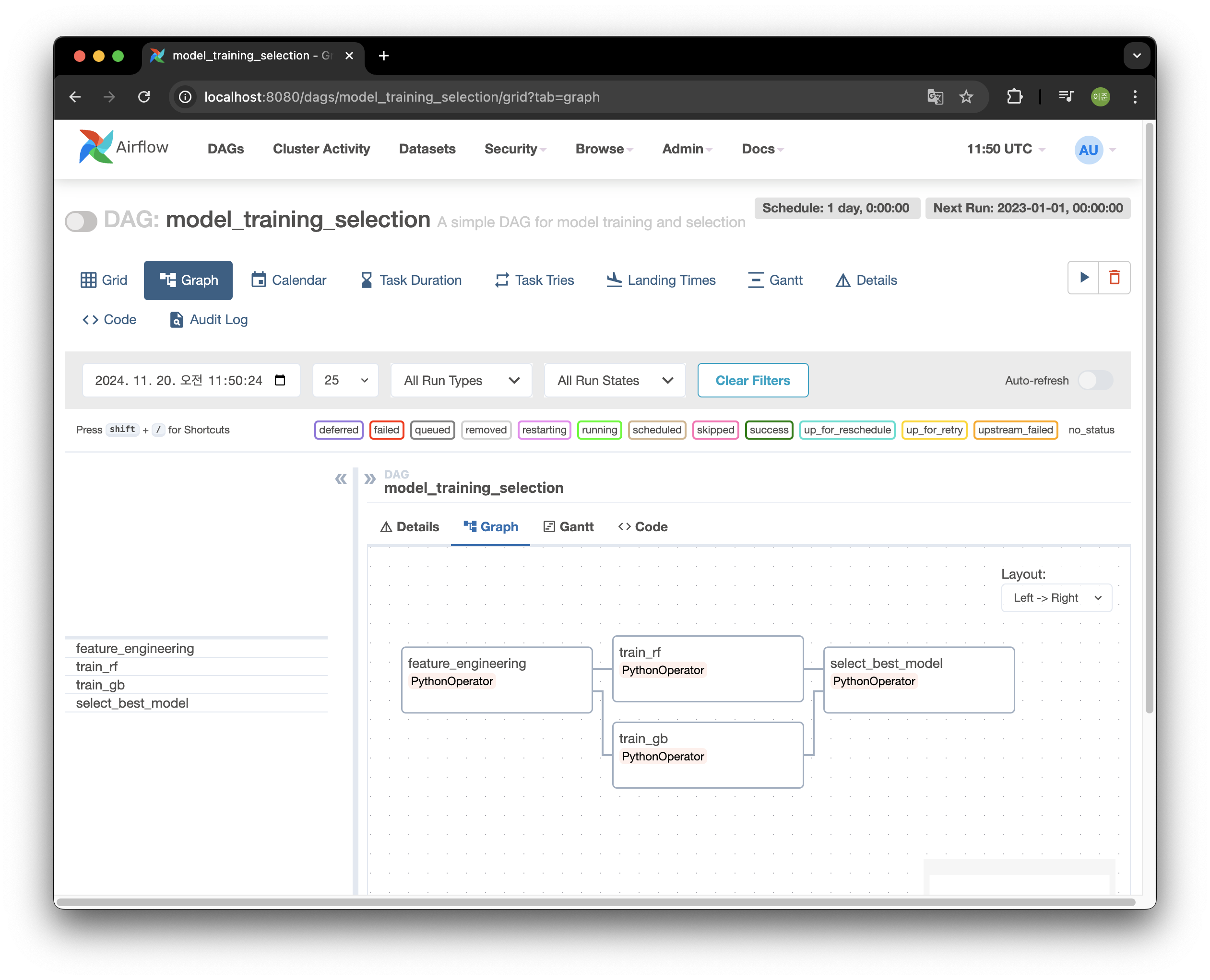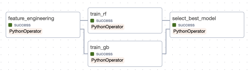 플로우는 피처 엔지니어를 진행한 뒤에 하나의 task에서는 randomforest로, 다른 하나는 gradient boosting 기반으로 모델을 돌려서 둘 중 최고 성능의 모델을 선택하는 DAG를 작성해 보자.
