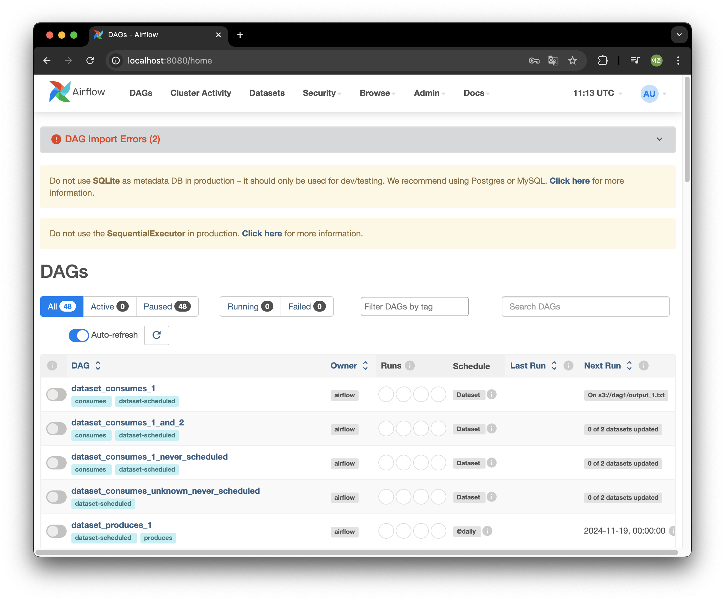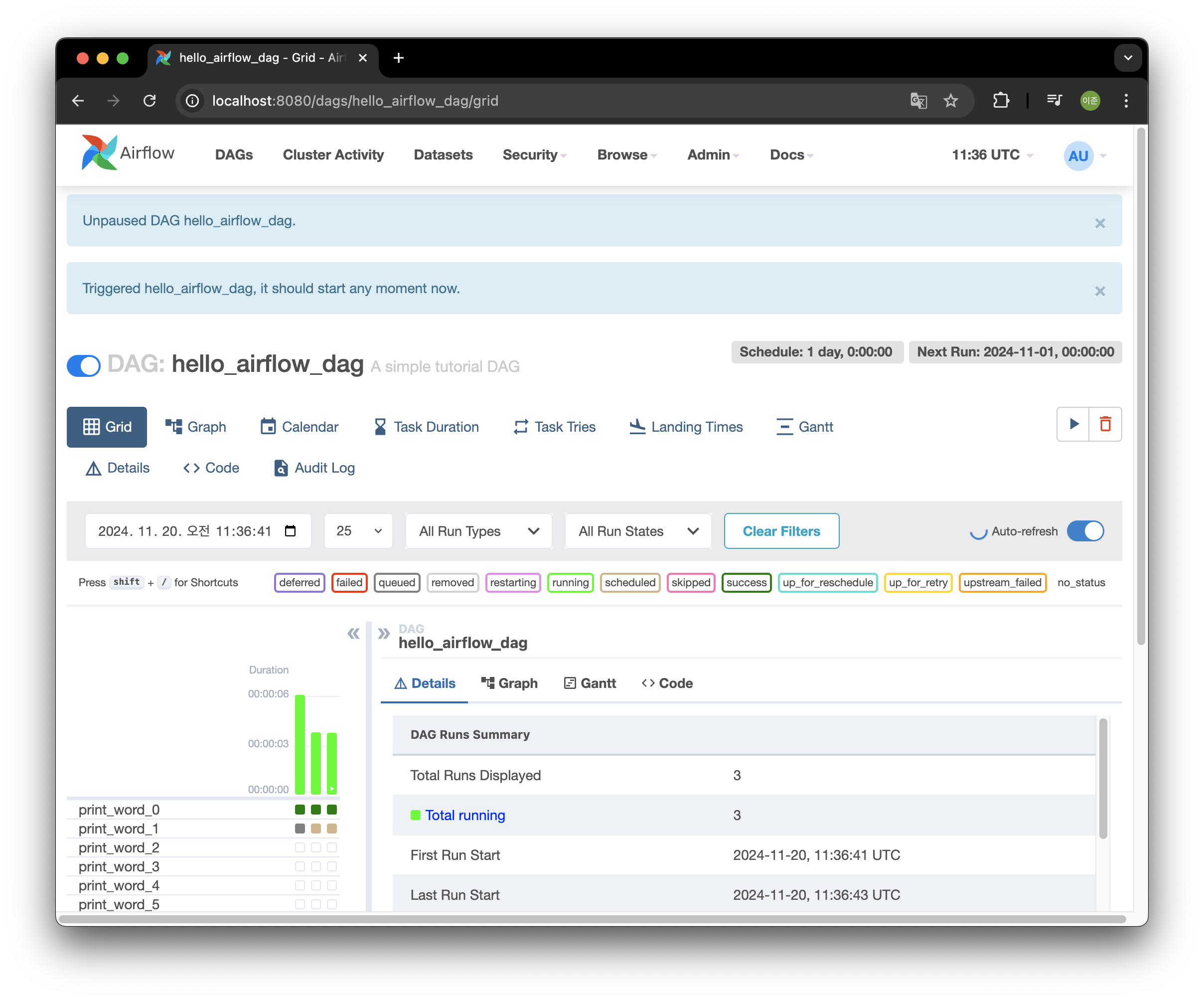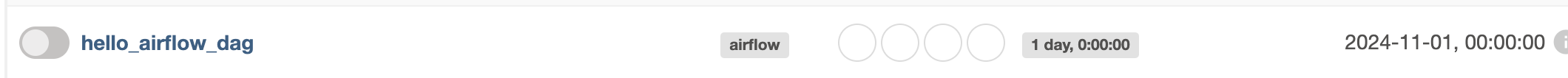 지금은 우리가 작성한 코드에서 에러가 안 나니 페이지에서 기다리면 이렇게 hello_airflow_dag가 나온다.