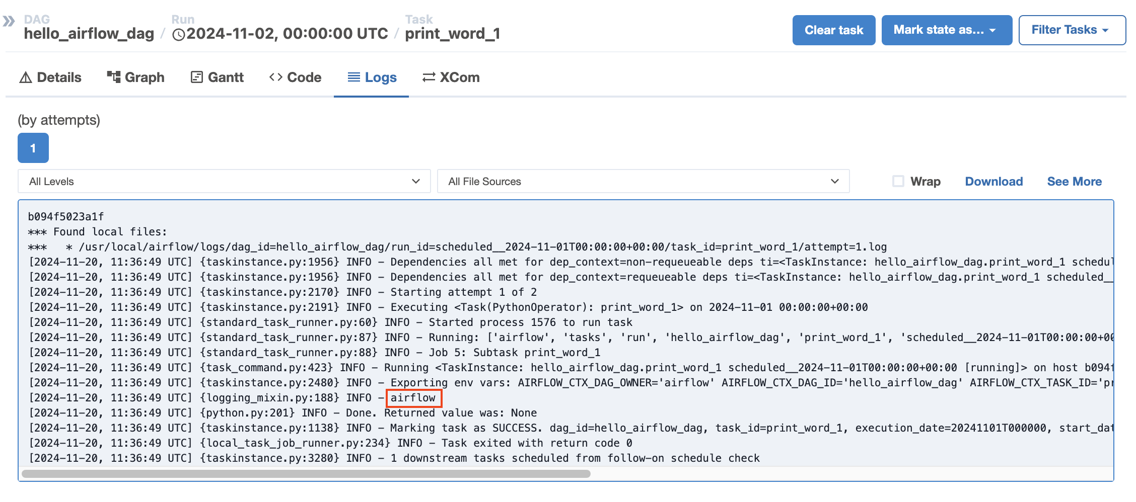 두 번째 task에 들어가서 보면 airflow가 잘 찍힌 걸 볼 수 있다.