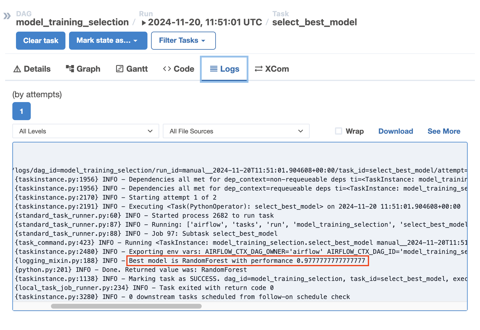 실행시켜 주고 성공한 다음 마지막 태스크의 로그를 보면 최고 성능 모델 로그도 잘 찍힌 걸 볼 수 있다.