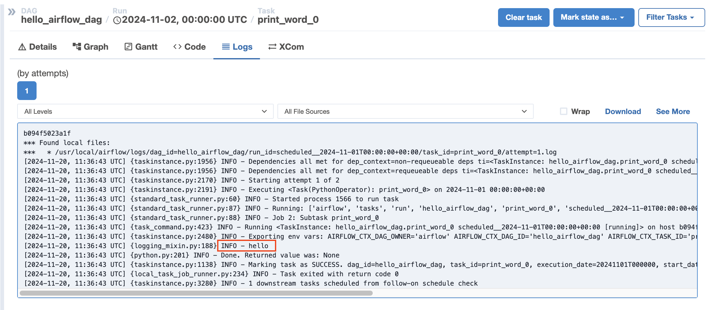 첫 번째 task에 들어가서 로그를 보면 hello가 잘 찍힌 걸 볼 수 있고