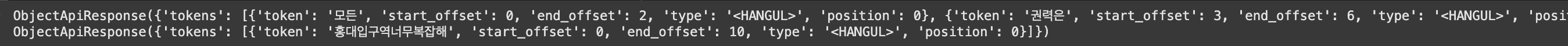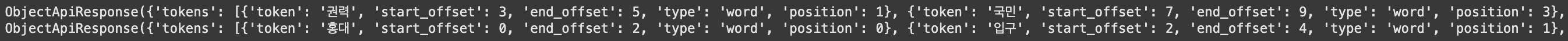 ObjectApiResponse({'tokens': [{'token': '권력', 'start_offset': 3, 'end_offset': 5, 'type': 'word', 'position': 1}, {'token': '국민', 'start_offset': 7, 'end_offset': 9, 'type': 'word', 'position': 3}, {'token': '나오', 'start_offset': 14, 'end_offset': 17, 'type': 'word', 'position': 5}]}) ObjectApiResponse({'tokens': [{'token': '홍대', 'start_offset': 0, 'end_offset': 2, 'type': 'word', 'position': 0}, {'token': '입구', 'start_offset': 2, 'end_offset': 4, 'type': 'word', 'position': 1}, {'token': '역', 'start_offset': 4, 'end_offset': 5, 'type': 'word', 'position': 2}, {'token': '복잡', 'start_offset': 7, 'end_offset': 9, 'type': 'word', 'position': 4}]})
