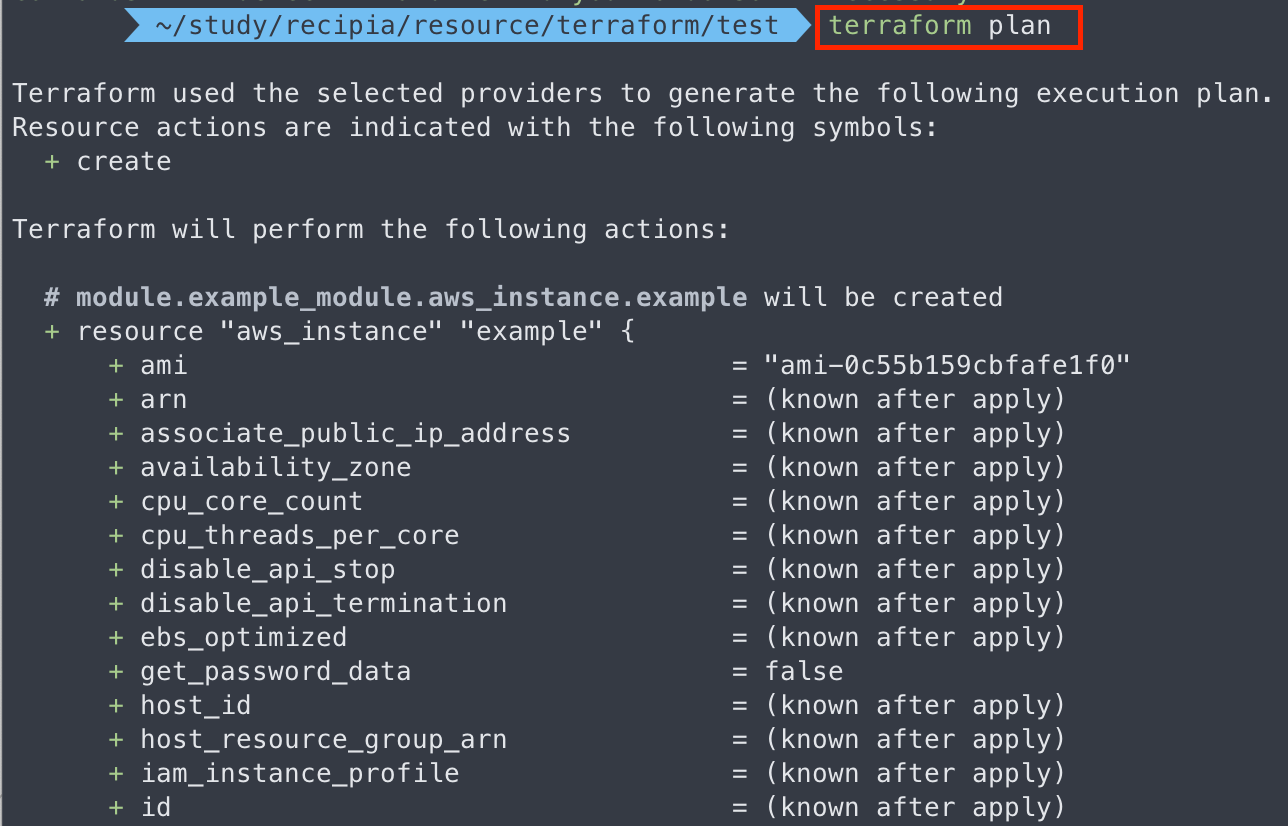 다음은 terraform plan 명령어를 실행한 터미널 모습이다.