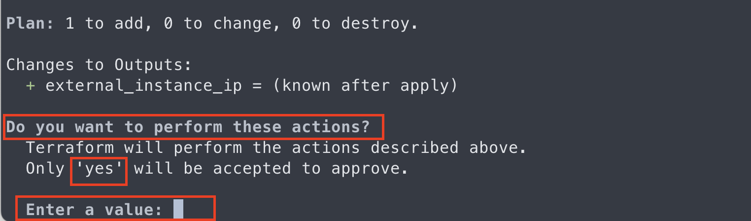 마지막으로, Terraform은 실제로 이 변경 사항을 적용하기 전에 사용자의 승인을 요청하고 있다. 'yes'를 입력하면 Terraform이 리소스를 생성하고, 아무 것도 입력하지 않거나 'no'를 입력하면 아무런 작업도 수행되지 않는다.
