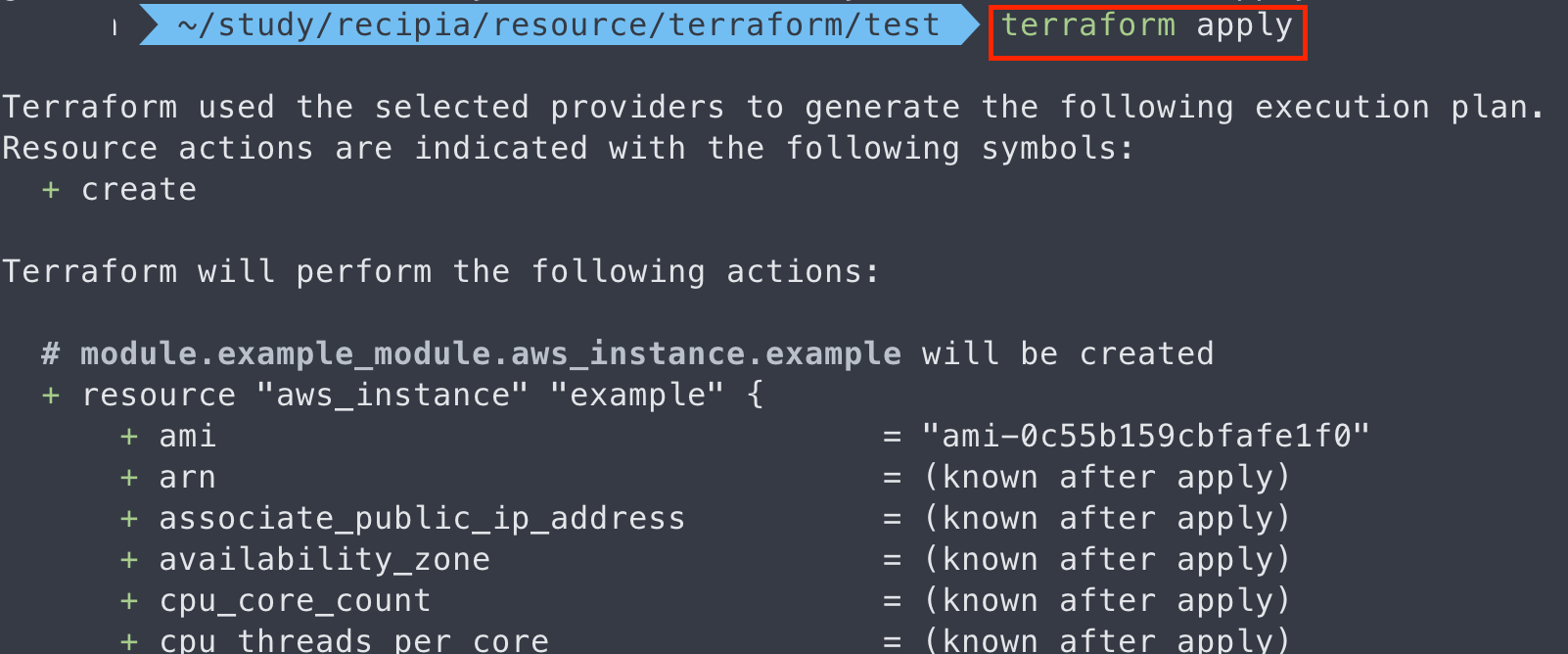 - Plan: 1 to add: 새로운 AWS 인스턴스가 생성될 예정임을 의미한다. 여기서 '1 to add'는 Terraform이 실행될 때 인프라에 새롭게 추가될 자원의 수를 나타낸다.