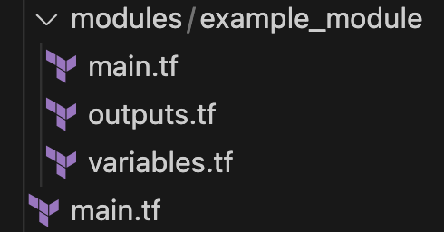 이 디렉토리 구성은 modules/example_modules 안에 모듈을 작성하고 외부에 이 모듈을 실제로 사용하는 main.tf가 있는 모습이다.