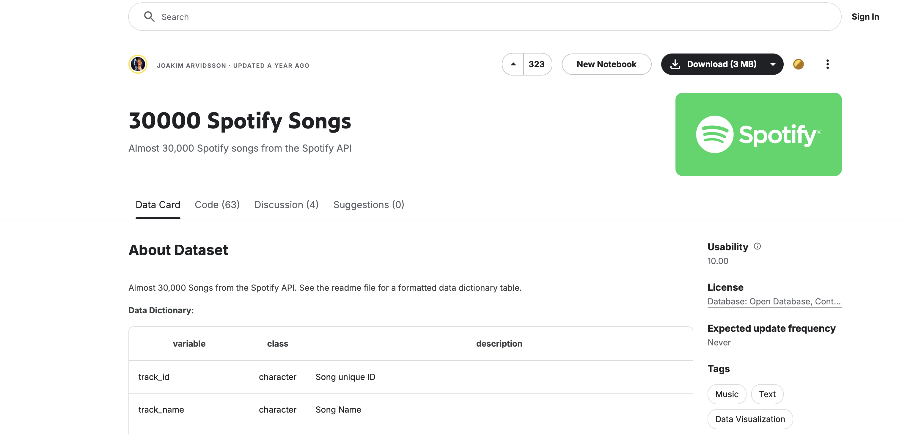 우리가 사용한 데이터는 Kaggle에서 제공하는 spotify_songs.csv 파일로, 약 30,000곡의 데이터와 음악의 다양한 피처가 포함된 데이터셋이다.