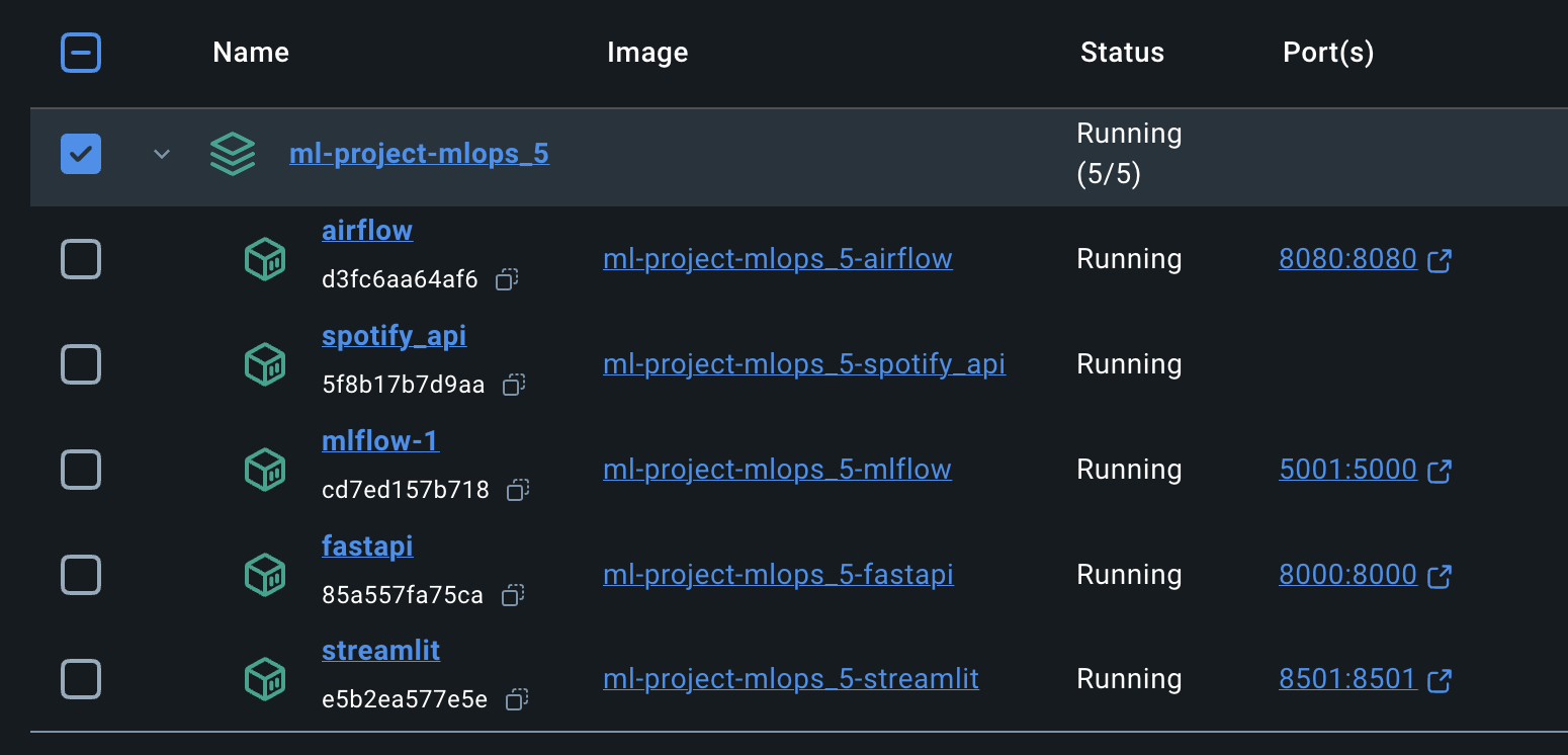 Airflow, MLflow, Spotify API와 더불어 FastAPI와 Streamlit도 도커로 실행하기로 결정했다. 각 서비스가 /app/dags 디렉토리를 공유하도록 설정해, FastAPI와 Streamlit에서도 데이터를 접근할 수 있도록 했다. 이를 통해 FastAPI와 Streamlit 모두 원활하게 작동하는 것을 확인했다.