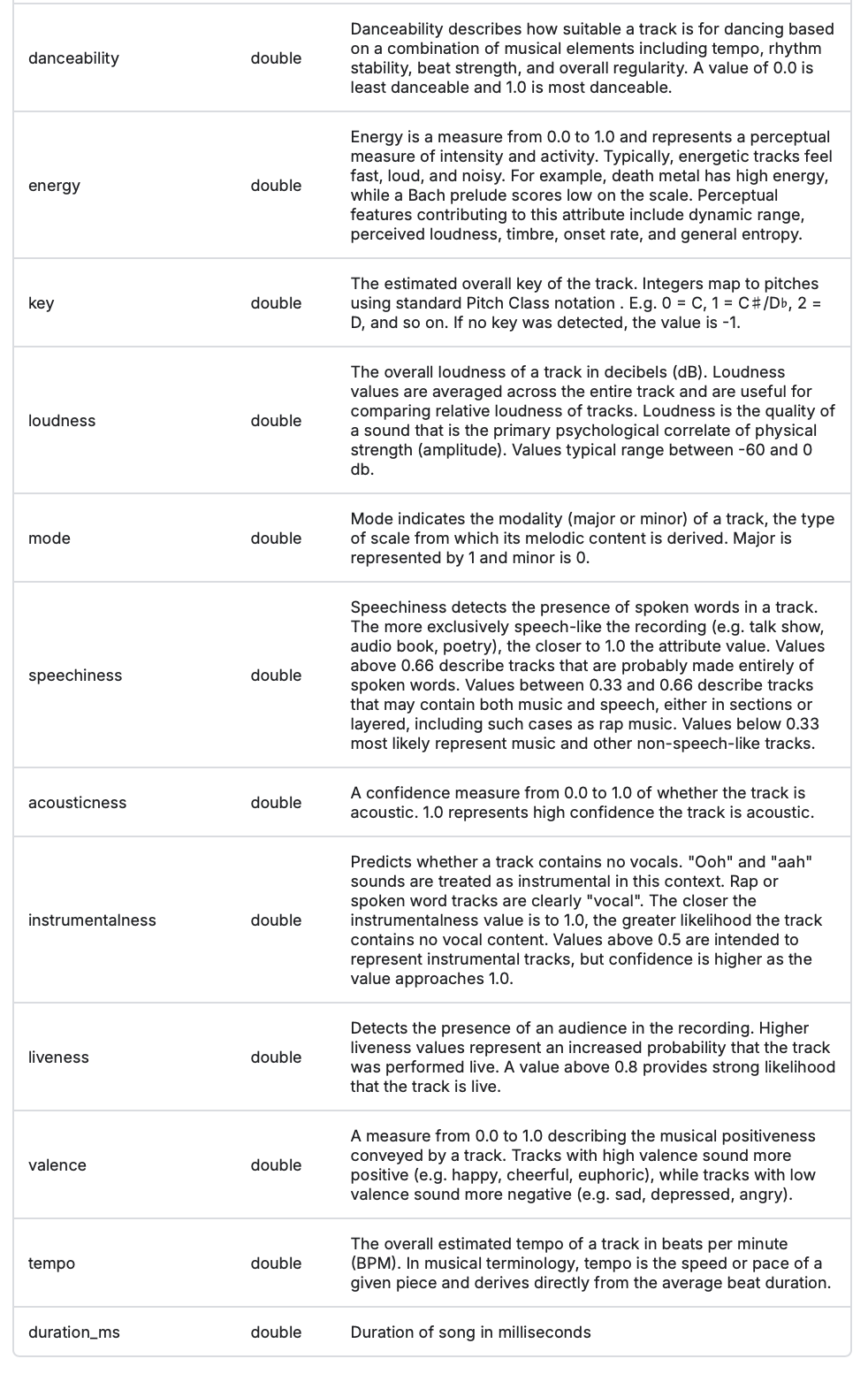이 데이터를 기반으로 최초 모델을 학습시켜, 군집화(clustering) 알고리즘을 통해 유사한 음악을 추천하는 모델을 개발하기로 했다.