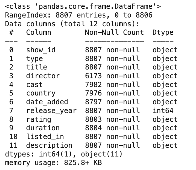 # 결측치 비율 : date_added(0.11%), rating(0.05%), duration(0.03%)