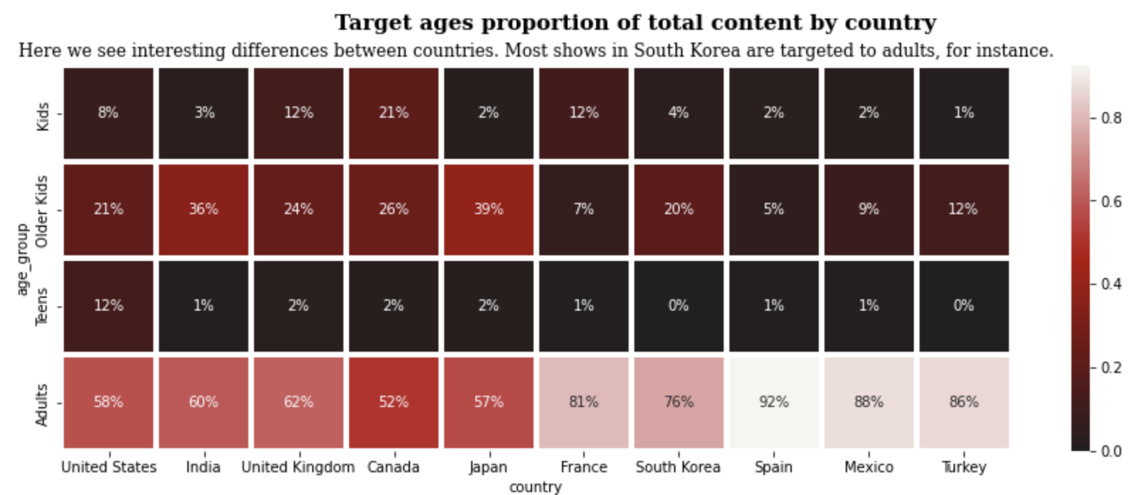 plt.title('Here we see interesting differences between countries. Most shows in South Korea are targeted to adults, for instance.',fontsize=12,fontfamily='serif')