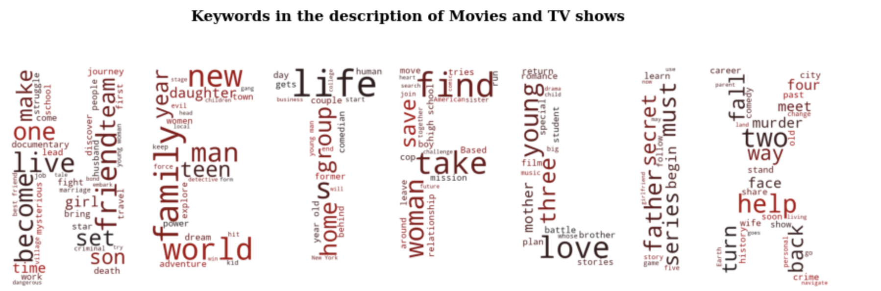 plt.suptitle('Keywords in the description of Movies and TV shows', fontweight='bold', fontfamily='serif', fontsize=15)