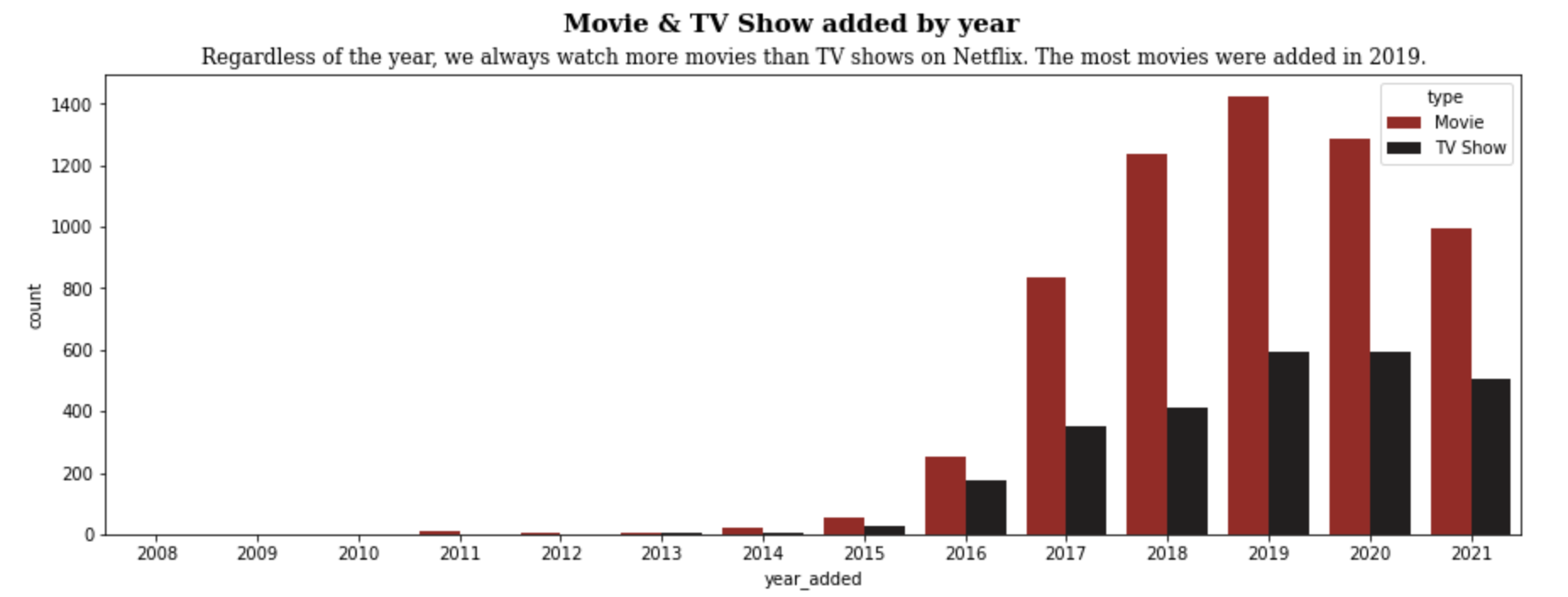 plt.title('Regardless of the year, we always watch more movies than TV shows on Netflix. The most movies were added in 2019.', fontfamily='serif', fontsize=12)