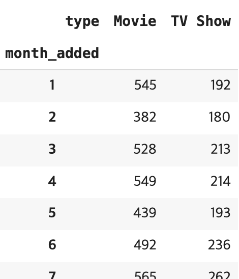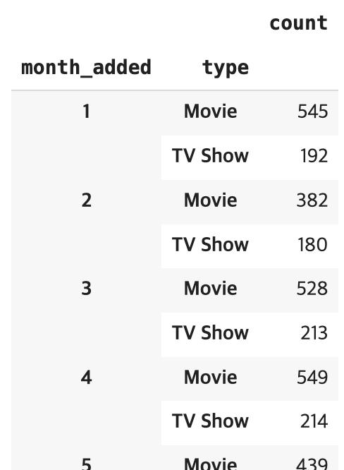 netflix_month = netflix.groupby('month_added')['type'].value_counts()