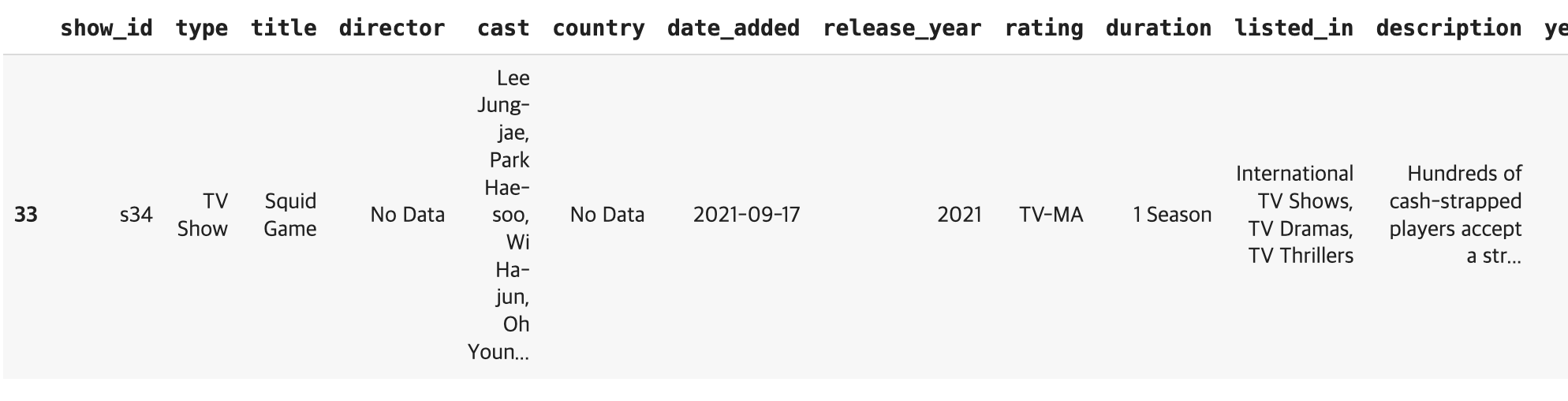 - 오징어 게임을 검색한 조건을 netflix 원본 데이터에 넣어서 True인 값만 출력