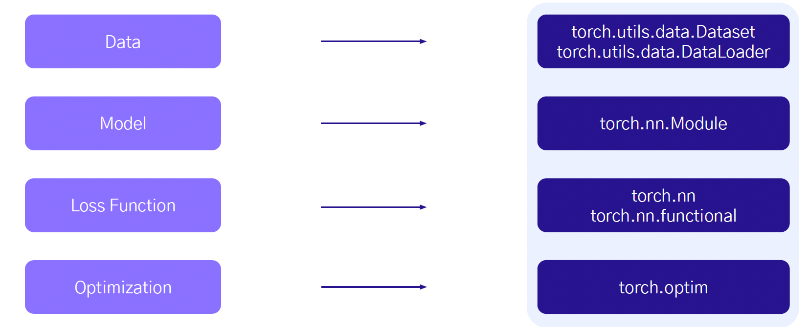 Dataset, DataLoader를 이용해서 데이터를 만들게 되고, 만들어진 데이터를 모델에 넘겨주게 된다. 이 모델의 연산과정을 통해서 Output을 내게 된다. 이 Output을 이용해서 Loss를 계산하게 된다. 계산된 Loss들을 이용해서 모델의 파라미터를 업데이트하는 Optimization을 진행하게 된다.