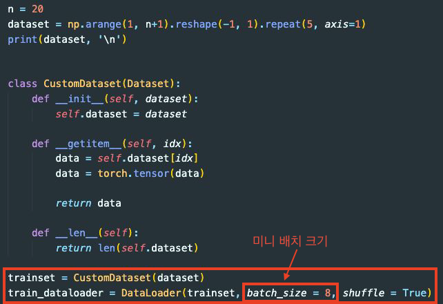 DataLoader의 역할은 데이터를 미니 배치로 묶어서 반환하는 것인데, 이는 인자로 주어진 Dataset을 이용해서 데이터 셋의 단일 데이터들을 정해진 개수만큼 모아 미니 배치(mini-batch)를 구성하는 역할을 한다.