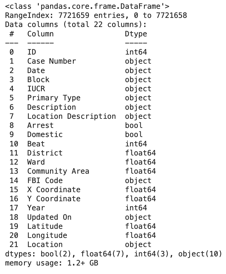 지금 데이터는 값이 혼재되어 있기 때문에 그냥 읽으면 에러가 난다. 그래서 dtype으로 Community Area, IUCR, Ward를 설정해 줬다.