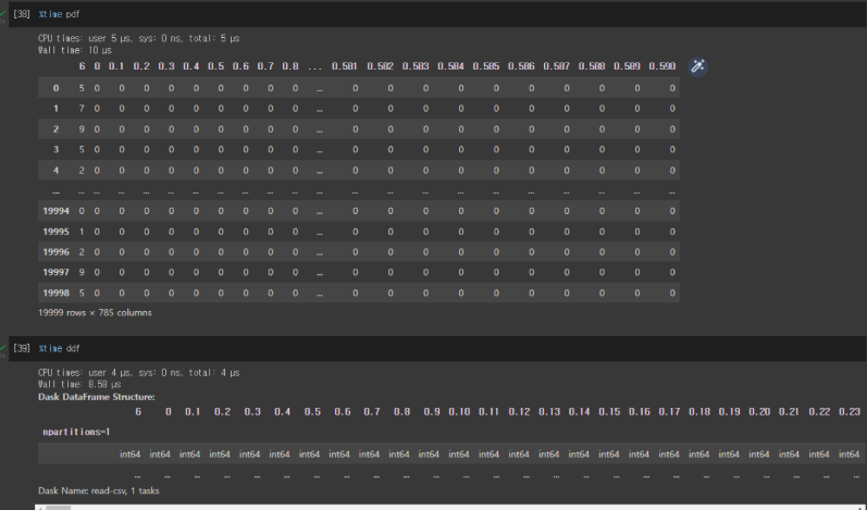 pandas 프레임을 뿌려보면 이미 다 로딩 되었으니까 5ms로 얼마 안걸린다. dask df를 뿌려보면 시간은 똑같이 4ms 걸렸지만 아무것도 뿌려지는 게 없다. 이건 현재 필요해서 사용하는 단계까지 오지 않았기 때문이다.