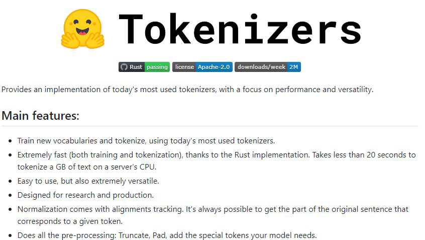 Huggingface는 자언어처리에서 범용적으로 사용되는 대표적인 라이브러리다. Tokenizers의 경우 사전 학습된 다양한 언어모델들의 tokenization과 어휘사전 등을 지원한다. 이외에도 Models, Dataset, Evaluation 등 다양한 하위 라이브러리들을 제공한다.