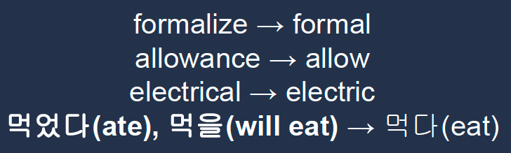 - 어간(stem) : 단어의 의미를 담고 있는 단어의 핵심 부분