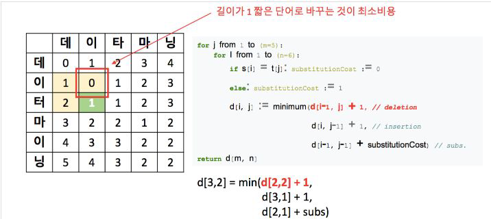 - 나는 -> 난: 한글자만 바꾸면 되기 때문에 Edit distance는 1이다.